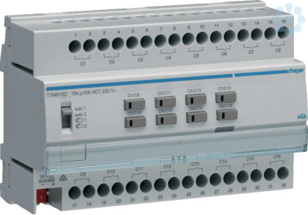 Schalt-/Jalousieaktor 16/8-fach KNX, 16A, C-Last. Reiheneinbaugerät mit integriertem Busankoppler. Dient zum Schalten von unabhängigen Lasten oder zur Ansteuerung von Antrieben und ist ausgestattet mit potentialfreien Schließern und kann mehrphasig angeschlossen werden. Schalten oder Rollladen-/Jalousieantrieb im Auf- oder Abbetrieb. Zur Steuerung von Beleuchtungsausgängen kann zwischen EIN/AUS, Zeitschaltung, Sicherheits-Aus, Zwangssteuerung, Sperr-, Logik-, Preset-, Verzögerungsfunktion oder 64 Szenen ausgewählt werden. Mit Umschaltfunktion für Zeit oder Dauerfunktion. Über die Jalousiefunktion kann der Fahrbefehl AUF/AB/Stopp und der Lamellenwinkel verstellt werden. Prozentansteuerung der Jalousie zum Fahren einer vordefinierten Position. Mit der Sonnenschutzfunktion kann in Verbindung mit einem Außensensor die Helligkeit pro Raum gesteuert werden. Mit Alarmfunktion zur Steuerung der Jalousie in eine definierte Position. Sicherheitsabfahrt solange die Taste gedrückt bleibt. 64 Szenenfunktionen pro Kanal. L