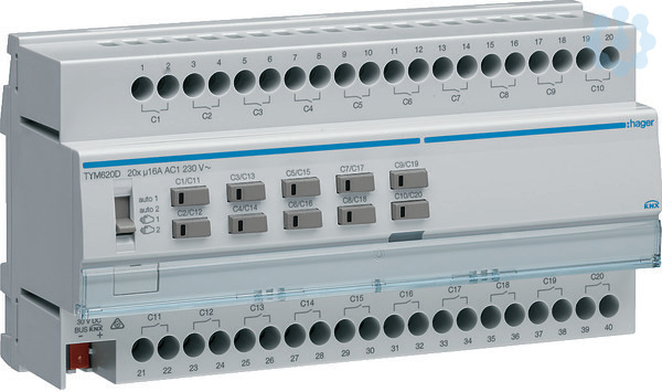 Schalt-/Jalousieaktor 20/10-fach KNX,16A CLast. Reiheneinbaugerät mit integriertem Busankoppler. Dient zum Schalten von unabhängigen Lasten oder zur Ansteuerung von Antrieben und ist ausgestattet mit potentialfreien Schließern und kann mehrphasig angeschlossen werden. Schalten oder Rollladen-/Jalousieantrieb im Auf- oder Abbetrieb. Zur Steuerung von Beleuchtungsausgängen kann zwischen EIN/AUS, Zeitschaltung, Sicherheits-Aus, Zwangssteuerung, Sperr-, Logik-, Preset-, Verzögerungsfunktion oder 64 Szenen ausgewählt werden. Mit Umschaltfunktion für Zeit oder Dauerfunktion. Über die Jalousiefunktion kann der Fahrbefehl AUF/AB/Stopp und der Lamellenwinkel verstellt werden. Prozentansteuerung der Jalousie zum Fahren einer vordefinierten Position. Mit der Sonnenschutzfunktion kann in Verbindung mit einem Außensensor die Helligkeit pro Raum gesteuert werden. Mit Alarmfunktion zur Steuerung der Jalousie in eine definierte Position. Sicherheitsabfahrt solange die Taste gedrückt bleibt. 64 Szenenfunktionen pro Kanal. Log