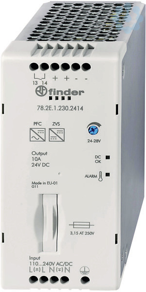 DIN-Schienen Schaltnetzteil, Eingang 110-240 V AC/DC, Ausgang 240 W bei 24 V DC, Ausgangsspannungsbereich einstellbar von 24-28 V DC. Ausgangskontakt: Positive Logik, Ausgangsnennstrom 10 A, max. Spitzenstrom 25 A-5 ms, interner Thermoschutz, Kurzschlussschutz am Ausgang. 2-stufiges Netzteil mit aktiven PFC: Nach Abschalten des Netzteiles - Reset durch Wegnahme der Versorgungsspannung. Die Eingangssicherung ist austauschbar. Breite 60 mm, für Tragschiene 35 mm (EN 60715).