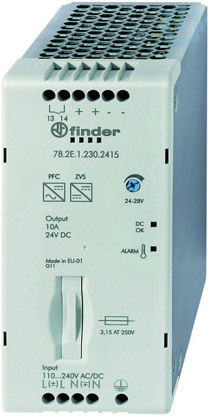 DIN-Schienen Schaltnetzteil, Eingang 110-240 V AC/DC, Ausgang 240 W bei 24 V DC, Ausgangsspannungsbereich einstellbar von 24-28 V DC. Ausführung mit Vorwarnkontakt. Ausgangsnennstrom 10 A, max. Spitzenstrom 25 A-5 ms, interner Thermoschutz, Kurzschlussschutz am Ausgang. 2-stufiges Netzteil mit aktiven PFC: Nach Abschalten des Netzteiles - Reset durch Wegnahme der Versorgungsspannung. Mit Vorwarnung über LED-Anzeige und Ausgangskontakt. Die Eingangssicherung ist austauschbar. Breite: 60 mm, für Tragschiene 35 mm (EN 60715).