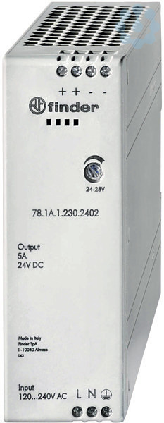 DIN-Schienen Schaltnetzteil, Eingang 120-240 V AC, Ausgang 120 W bei 24 V DC, Ausgangsspannungsbereich einstellbar von 24-28 V DC, Ausgangsnennstrom 5 A (bei 230 V AC am Eingang), maximaler Spitzenstrom 10 A-5 ms, Kurzschlussschutz am Ausgang, Breite 42,5 mm, für Tragschiene 35 mm (EN 60715)