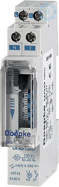 Zeitschaltuhren schalten zu festgelegten Zeiten einen Kontakt ein oder aus. Sie helfen Energiesparmaßnahmen umzusetzen. Die mechanischen Zeitschaltuhren UNO steuern einen elektrischen Lastkreis über Tages- oder Wochenprogramme. Die Programmautomatik ist ausschaltbar. Einige Modelle verfügen über eine Gangreserve. Diese stellt sicher, dass auch bei einem zeitweisen Spannungsausfall die Verbraucher zuverlässig geschaltet werden. Eigenschaften: mechanisches Schaltrad mit unverlierbaren Schaltschiebern. Tagesprogramm (Uno-D, Uno-QRD) oder Wochenprogramm (Uno-QRS). kleinste Schaltzeiten von 15 min (Uno-D, Uno-QRD) bzw. 2 h (Uno-QRS) Gangreserve: keine (Uno-D) bzw. 150 Stunden (Uno-QRD/-QRS) hohe Ganggenauigkeit. Steuerschalter für Dauerbetrieb. 1 potenzialfreier Schließerkontakt 16 (4) A / 250 V AC. Betriebsspannung: 230 V AC. geringer Eigenverbrauch. plombierbare Klarsichtabdeckung. Modulbreite nur 1 Teilungseinheit (17,5 mm), Schutzart IP 20. Montageart: Schnellbefestigung auf Tragschiene. Einbaulage beliebig. E