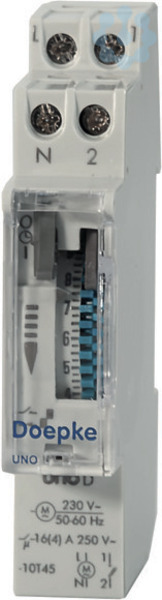 Zeitschaltuhren schalten zu festgelegten Zeiten einen Kontakt ein oder aus. Sie helfen Energiesparmaßnahmen umzusetzen. Die mechanischen Zeitschaltuhren UNO steuern einen elektrischen Lastkreis über Tages- oder Wochenprogramme. Die Programmautomatik ist ausschaltbar. Einige Modelle verfügen über eine Gangreserve. Diese stellt sicher, dass auch bei einem zeitweisen Spannungsausfall die Verbraucher zuverlässig geschaltet werden. Eigenschaften: mechanisches Schaltrad mit unverlierbaren Schaltschiebern. Tagesprogramm (Uno-D, Uno-QRD) oder Wochenprogramm (Uno-QRS). kleinste Schaltzeiten von 15 min (Uno-D, Uno-QRD) bzw. 2 h (Uno-QRS) Gangreserve: keine (Uno-D) bzw. 150 Stunden (Uno-QRD/-QRS) hohe Ganggenauigkeit. Steuerschalter für Dauerbetrieb. 1 potenzialfreier Schließerkontakt 16 (4) A / 250 V AC. Betriebsspannung: 230 V AC. geringer Eigenverbrauch. plombierbare Klarsichtabdeckung. Modulbreite nur 1 Teilungseinheit (17,5 mm), Schutzart IP 20. Montageart: Schnellbefestigung auf Tragschiene. Einbaulage beliebig. E