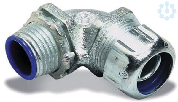 90° - abgewinkelte Metall-Verschraubung, fuer fluessigkeitsdichte Metall-Schutzschlaeuche, aus galvanisiertem Stahlguss mit verchromter Oberflaeche, Innenhuelse aus Polyamid, Nenngroeße 3/8 Zoll bzw 16 mm, Gewindeanschluss NPT 1/2 Zoll, Schutzklasse