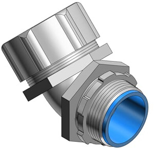 45° - abgewinkelte Metall-Verschraubung, fuer fluessigkeitsdichte Metall-Schutzschlaeuche, aus galvanisiertem Stahlguss mit verchromter Oberflaeche, Innenhuelse aus Polyamid, Nenngroeße 1 1/2 Zoll bzw 50 mm, Gewindeanschluss NPT 1 1/2 Zoll, Schutzklasse