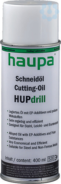 Schneidöl HUPdrillAnwendung HUPdrill: Gezielte und saubere Anwendung beim Schneiden, sehr ergiebig und effizient im Verbrauch durch Dosiersprühkopf. Für Maschinen, bei denen eine vollständige Trennung des Kühlschmierstoffes von dem eingesetzten Hydrauliköl oder Schmieröl nicht gegeben ist. Geeignet für die Bearbeitung von Eisen, Leicht- und Buntmetallen. Eigenschaften: HUPdrill Spezial Schneidöl, transparent. Legiertes Öl enthält hochwirksame EPAdditive und polare Wirkstoffe, elastischer Schmierfilm mit Korrosionsschutz, hochbelastbar durch tragfähige Grenzschichtbildung, hohes Druckaufnahmevermögen. Sorgt für verschleißarmen Betrieb mit Korrosionsschutz.? Legiertes Öl mit EP-Additiven und polaren Wirkstoffen ? Sehr ergiebig und effizient ? Geeignet für Stahl, Leicht- und Buntmetalle