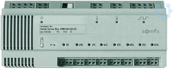 Inside Sensor Box ist die Schnittstelle zwischen den Innentemperatursensoren und dem animeo Building Controller (TouchBuco), zwei Temperatursensoren können angeschlossen werden, für die Bedienung der acht Bereiche können außerdem acht Taster angeschlossen werden, bis zu zwei Inside Sensor Boxen können an ein System angeschlossen werden, BxHxT 210x90x61mm, 12TE, IP20, Hutschiene