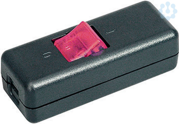 Schnur-Zwischenschalter, schwarz/rot, 10 (4) A, 250V, 2-polig, Gehäuse und Zugentlastung geschraubt, Verbindungsklemme für den Schutzleiter, Kennzeichnung 0-I, Schraubkontakte für Kabel 2x0,75mm², LBH 80x30x25mm, VDE-geprüft und beleuchtet