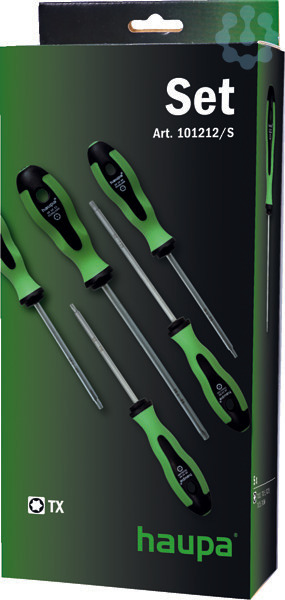 Schraubendreher-Set TxSchraubendreher-Sortiment Tx mit Sicherungspin, mit 2-Komponenten-Heft aus PP/TPE-Material, Klinge aus Molybdän-Vanadium-Stahl, gehärtet, gestrahlt, verchromt, mit schwarzer Spitze, 5-teilig.Inhalt: je 1 Schraubendreher Tx 10, Tx 15, Tx 20, Tx 25, Tx 30