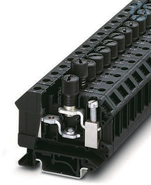 Sicherungsreihenklemme, Art der Sicherung: Glas / Keramik / ..., Anschlussart: Schraubanschluss, Querschnitt: 0,5 mm²- 16 mm², AWG: 20 - 6, Nennstrom: 10 A, Nennspannung: 400 V, Breite: 12 mm, Sicherungstyp: G / 6,3 x 32, Montageart: NS 35/7,5, NS 35/15, NS 32, Farbe: schwarz