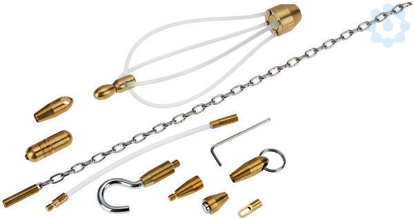 Schubstangen-Zubehör-Sortiment, 10-teilig: 1 Gleitaufsatz, 1 Adapter von M 6 auf M 5, 1 LED Lampe, 1 Führungskopf mit Ring, 1 Haken, 1 Führungskopf, 1 Kette, 1 Zugkopf, 1 Magnet, 1 Flex-Stab 15 cm, 10-teilig