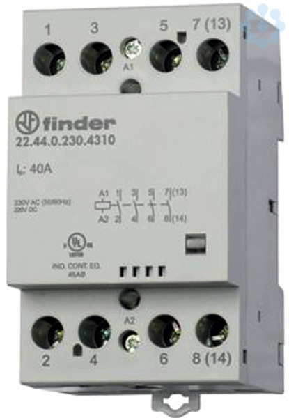 Installationsschütz für 35 mm-Schiene, 2 Öffner und 2 Schließer für 40 A / 440 V AC, Kontaktmaterial AgSnO², max. Einschaltstrom 176 A - 5 ms, max. Schaltleistungen bei 230 V AC: AC1-AC-7a: 16 kVA, Bemessungsstrom AC3-AC7b 22 A, Glüh- und Halogenlampen 4000 W, Leuchtstofflampen mit EVG 1500 W, Leuchtstofflampen unkompensiert 1500 W, Energiesparlampen 1000 W, LED (230 V AC) 1000 W, NV-Halogenlampen oder LED mit EVG 1000 W, NV-Halogenlampen oder LED mit KVG 1500 W, Spule: 230 V AC/DC, Breite 53,5 mm, mechanische Schaltstellungsanzeige, Relaisschutzart: IP 20