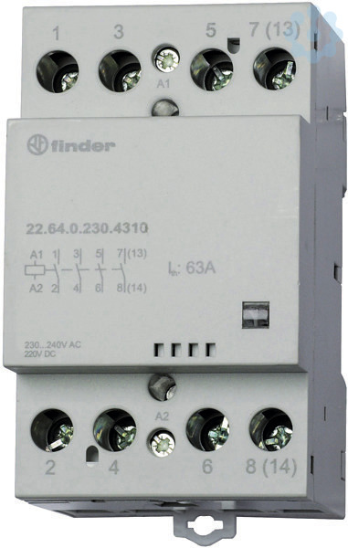 Installationsschütz für 35 mm-Schiene, 4 Schließer für 63 A / 440 V AC, Kontaktmaterial AgSnO², max. Einschaltstrom 240 A - 5 ms, max. Schaltleistungen bei 230 V AC: AC1-AC-7a: 24 kVA, Bemessungsstrom AC3-AC7b 30 A, Glüh- und Halogenlampen 5000 W, Leuchtstofflampen mit EVG 2000 W, Leuchtstofflampen unkompensiert 2000 W, Energiesparlampen 1500 W, LED (230 V AC) 1500 W, NV-Halogenlampen oder LED mit EVG 1500 W, NV-Halogenlampen oder LED mit KVG 2000 W, Spule: 230 V AC/DC, Breite 53,5 mm, mechanische Schaltstellungsanzeige, Relaisschutzart: IP 20