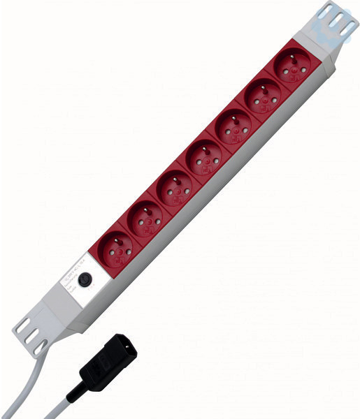 PROFIversal 7-fach, Mittenschutzkontakt-Ausführung (MSK), für USV- Anwendungen, mit Feinsicherung 10A, mit 45° gedrehten Töpfen, 44,45mm Topfabstand, universelle Befestigungsmöglichkeit, wiederanschließbar, Zuleitung H05VV-F3G1,5mm², Länge 2m, mit Kaltgerätestecker, 250VAC, 10A, Länge 482,6mm, UTE,CEE7/V, aluminium-rot