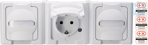 Aufputz-Feuchtraum, Schutzkontakt-Steckdose, 3-fach, fertig verdrahtet, alle Klappdeckel mit Beschriftungsfeld, waagerecht, 16A, 250V~, IP44, BLUE ELECTRIC, arktis