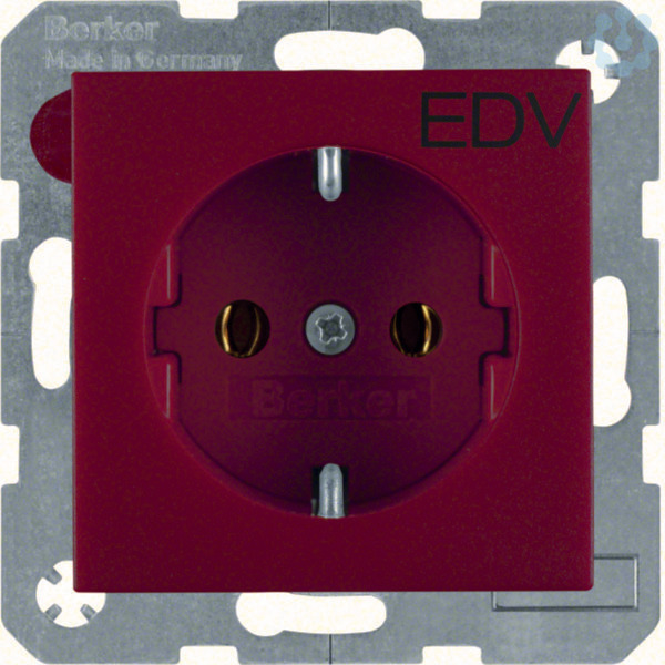 Steckdose SCHUKO mit Aufdruck S.1/B.3/B.7 rot, matt. Steckdose SCHUKO® mit Aufdruck - EDV -, mit Steckklemmen nach VDE 0620 als Verbindungsklemmen ausgeführt und genehmigt, mit einteiligem Erdungsbügel. Unterputz-Installation, Standard-/Flächen-/Designprogramm. Material: Kunststoff, Thermoplast, bruchsicher, halogenfrei.