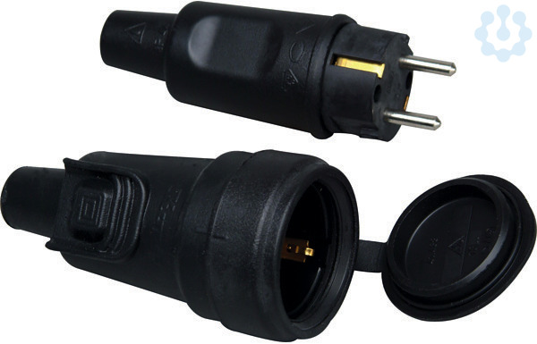 Gummi-Steckverbindungs-Set, Schutzkontakt-Vollgummistecker und Schutzkontakt-Gummikupplung, mit Steckerverriegelung und Spritzwasserkappe, bruchfest, schlagfest, Einsatz: Polyamid, Kappe: Gummi, für Kabelquerschnitte bis 3x2,5mm², Schutzart IP44, 16A, 250~, Farbe: schwarz