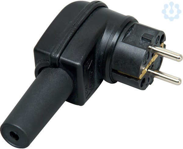 Vollgummi-Schutzkontakt-Winkelstecker, IP44, schwere Ausführung mit Knickschutztülle und 2 Schutzkontaktsystemen gemäß CEE-Norm 7/VII, bruchfest, schlagfest, formbeständig auch bei härtestem Einsatz, Einsatz: Gummi, Kappe: Gummi, für Kabelquerschnitt bis 3x2,5mm², 16A, 250V~, schwarz