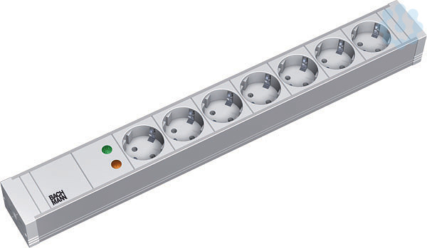 19° - Steckdosenleiste Kunststoff > 1HE 7x Schutzkontaktdosen 35° grau mit Überspannungsschutz, Länge: 440mm. Endstücke genietet, nicht öffenbar. 2,0m H05VV-F3G1,50mm² grau mit Schutzkontaktwinkelstecker. inkl. Befestigungswinkel.