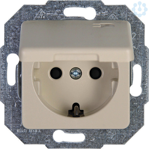 Schutzkontakt-Steckdose mit erhöhtem Berührungsschutz und Klappdeckel im Design EUROPA und der Farbecremeweiß. DerNennstrom beträgt 16A und die Nenn spannung 250V~, SchutzartIP20