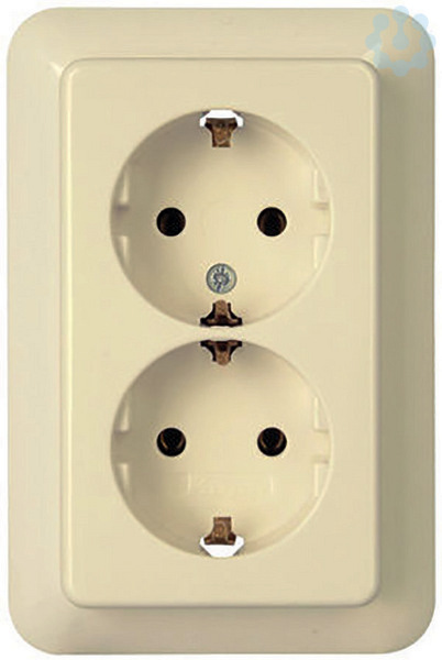 2-fach Schutzkontakt-Steckdoseim Design RIVO und der Farbe cremeweiß, ohne erhöhten Berührungsschutz, Komplettgerät für den Einbau in eine 1-fach Schalterdose Ø60mm, 16A, 250V~, Schutzart IP20