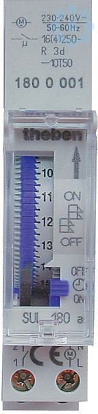 Reiheneinbau-Zeitschaltuhr mit 3 Tage Gangreserve, Breite 1 TE, 24-Std.-Segment-Prog., kürzeste Schaltzeit 15 Min., Dauerschalter EIN/AUS