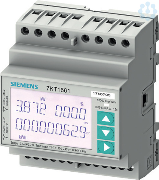 SENTRON, Messgerät, 7KT PAC1600, LCD, L-L: 400 V, L-N: 230 V, 5 A, Hutschienengerät, 3-phasig, M-bus + MID, Schein- / Wirk- / Blindenergie, eigenversorgt, Schraubanschluss