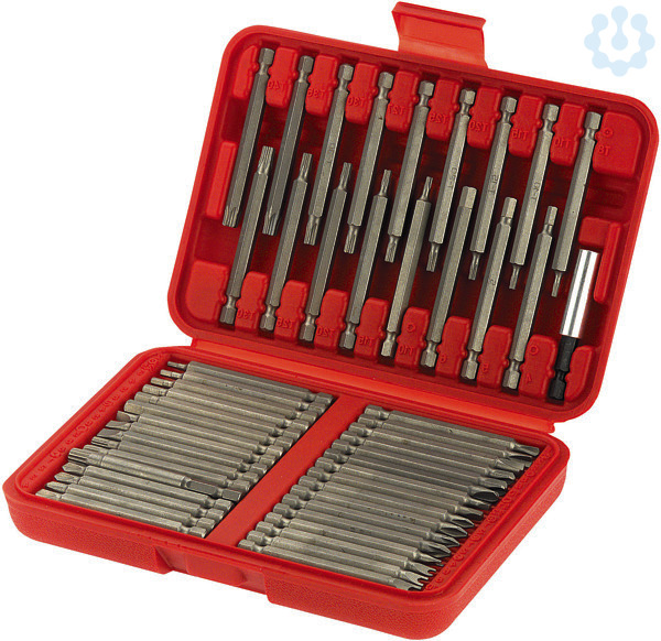 Bit Set - 50-teiliges Sortiment Lange-Sicherheits-Bits für Arbeiten an Schrauben aller Art, insb. Sicherheits- und Spezialschrauben, dank Ã?berlänge von 75 mm hervorragend geeignet auch an wenig zugänglichen Stellen bei beengten Platzverhältnissen, mit Standard-Sechskant-Aufnahme 1/4für Akkuschrauber- und andschrauber-Betrieb, aus Chrom-Vanadium-Stahl, übersichtlich und verrutschsicher aufbewahrt in schlagfester Kunststoffbox (195 x 135 x 38 mm). Inhalt: Je 1 Stück Schraub-Bits Universal-Bithalter, mit 1/4-Sechskant-Ausnahme und Dauermagnet, Länge 60 mm Schlitz 4 mm 5 mm 6 mm Schlitz mit Aussparung (Spanner / Klauenschlüssel) 4 mm 6 mm 8 mm 10 mm Kreuzschlitz Phillips PH 1 PH 2 Kreuzschlitz Pozidriv PZ 1 PZ 2 Innen-Vierkant (Robertson) Gr. 1 Gr. 2 Innen-Sechskant (Innensechskant) 4 mm 5 mm 6 mm Innen-Sechskant (Innensechskant) mit Bohrung (Tamper Resistant) 2 mm 2, 5 mm 3 mm - 4 mm 5 mm 6 mm Torx T 10 T 15 T 20 T 25 T 30 Torx mit Bohrung (Tamper Resistant) T 27 TR T 30 TR T 35 T 40 TR Vierflügel (Torq-Set) TS