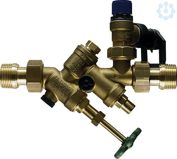 Serienmäßig ausgerüstet mit Absperrventil Rückflussverhinderer mit Prüfvorrichtung, Manometeranschluss, Membran-Sicherheitsventil und Ablauftrichter. Im Ablauftrichter des Sicherheitsventils ist ein Rohrunterbrecher integriert, der ein Rücksaugen des Ablaufwassers verhindert.