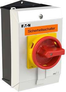Sicherheitsschalter, Sortiment: Sicherheitsschalter, Typkenner: P1, STOPP-Funktion: NOT-AUS-Funktion, mit rotem Drehgriff und gelbem Sperrkranz, Hinweis: mit Warnschild ?Sicherheitsschalter?, Information zum Lieferumfang: Hilfsschalterkontakt oder Neutralleiter nachrüstbar., 3-polig, Abschließbarkeit: abschließbar in 0-Stellung mit Deckelverriegelung, Schutzart: IP65, Bauform: Aufbau, Bemessungsbetriebsleistung AC-23A, 50 - 60 Hz 400 V: P = 11 kW, Bemessungsdauerstrom: Iu = 25 A, Normen und Bestimmungen: IEC/EN 60947, VDE 0660, IEC/EN 60204, Lasttrennschalter nach IEC/EN 60947-3