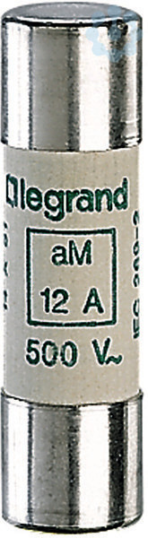 Legrand Zylindersicherung, Betriebsklasse aM (träge), Bemessungsstrom 12 A, Größe 14 x 51 mm, Bemessungsspannung 500 VAC, Ausschaltvermögen 100 kA, ohne Schlagbolzen, Betriebsklasse aM - Teilbereichs-Schutz von Motorstromkreisen, zur Anwendung wenn nur ein Kurzschlussschutz erforderlich ist.