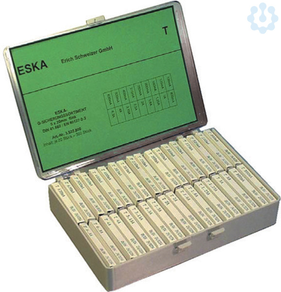 Sicherungssortiment 9 5x20mm träge mit 360 Feinsicherungen E3.522.800., Inhalt je 20 Stück:, 100mA, 125mA, 160mA, 200mA, 250mA, 315mA, 400mA, 500mA, 630mA, 800mA, 1A, 1,25A, 1,6A, 2A, 2,5A, 3,15A, 4A, 6,3A., Träge G-Sicherungseinsätze werden verwendet, wenn hohe Einschaltstromstöße auftreten, die nur langsam abklingen, wie z. B. beim Anlaufen belasteter Motoren.