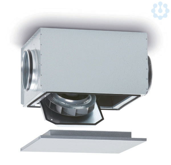 Gehäuse aus verzinktem Stahlblech mit runden Anschlussstutzen auf Normrohre abgestimmt. Schallabsorbierende Lochblech-Innenauskleidung, mit 50mm starker Mineralfaserplatte hinterlegt. Deckel abnehmbar. Ventilatorraum und Gehäusespirale frei zugänglich. Motor und Laufrad ausschwenkbar.