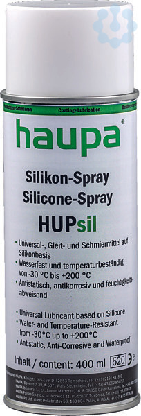 Silikon-Spray HUPsilAnwendung HUPsil: Zur Beseitigung von Knarr-, Quietsch- und Laufgeräuschen an Maschinen, Fahrzeugen, Ketten. Als Gleitmittel und als Alterungsschutz. Zur Reinigung, Pflege und zum Schutz von Metallen, Gummi und Kunststoff, zum Einziehen von Gummi und Kunststoffprofilen, etc. Eigenschaften: Das Silikon-Spray HUPsil ist ein Universal-, Gleit- und Schmiermittel. Es ist wasserfest, witterungs- und temperaturbeständig von -30°C bis +200°C. Es wirkt antistatisch und staubabweisend, schmiert und imprägniert alle Oberflächen ohne zu fetten, antikorrosiv und feuchtigkeitsabweisend.? Universal-, Gleit- und Schmiermittel auf Silikonbasis ? Wasserfest und temperaturbeständig von -30°C bis +200°C ? Antistatisch, antikorrosiv und feuchtigkeitsabweisend