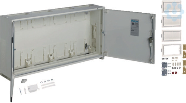 Sockelschrank, universN, 500x1050x205mm, SchutzklasseII, IP54, 144Platzeinheiten. Schrankgehäuse nach DIN VDE 0603/1, Maßnorm DIN 43 870 zur Aufputz, Unterputz oder teilversenkter Montage. Zum Aufbau einer Zählerverteileranlage bis 355 A, Bemessungsspannung 230/400 V 50 Hz. Schutzart IP31 (IP44/IP54 nach DIN VDE 0470/1), Schutzklasse II schutzisoliert, Schutzart IP3X hinter der Tür. Bestehend aus Schrank mit Tür aus pulverbeschichtetem, eingebranntem, stabil profiliertem 1 mm dickem Stahlblech. Innenauskleidung komplett aus Kunststoff. Leitungseinführungen oben und unten durch eingebaute Kunststoffflanschplatten, rückseitige Vorprägung im Kunststoffteil und Sammelschienendurchführungen als beidseitige seitliche Vorprägung im unteren Bereich. Tür frontbündig mit innenliegenden, justierbaren Scharnieren, wahlweise rechts oder links anschlagbar mit 110° Öffnungswinkel. Türverschluss mit Vorreiber, ab Breite 800 mm und bei allen Schränken ab einer Höhe von 1250 mm mit Dreipunktschließung. Türverschluss durch ande