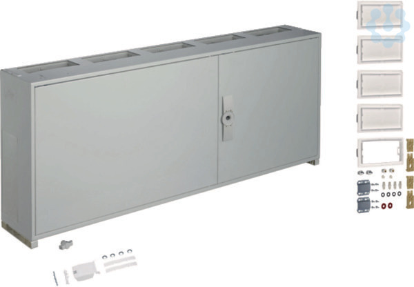 Sockelschrank, universN, 500x1300x205mm, SchutzklasseII, IP54, 108Platzeinheiten. Schrankgehäuse nach DIN VDE 0603/1, Maßnorm DIN 43 870 zur Aufputz, Unterputz oder teilversenkter Montage. Zum Aufbau einer Zählerverteileranlage bis 355 A, Bemessungsspannung 230/400 V 50 Hz. Schutzart IP31 (IP44/IP54 nach DIN VDE 0470/1), Schutzklasse II schutzisoliert, Schutzart IP3X hinter der Tür. Bestehend aus Schrank mit Tür aus pulverbeschichtetem, eingebranntem, stabil profiliertem 1 mm dickem Stahlblech. Innenauskleidung komplett aus Kunststoff. Leitungseinführungen oben und unten durch eingebaute Kunststoffflanschplatten, rückseitige Vorprägung im Kunststoffteil und Sammelschienendurchführungen als beidseitige seitliche Vorprägung im unteren Bereich. Tür frontbündig mit innenliegenden, justierbaren Scharnieren, wahlweise rechts oder links anschlagbar mit 110° Öffnungswinkel. Türverschluss mit Vorreiber, ab Breite 800 mm und bei allen Schränken ab einer Höhe von 1250 mm mit Dreipunktschließung. Türverschluss durch ande