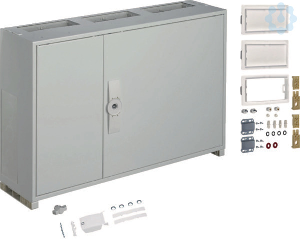 Sockelschrank, universN, 500x800x205mm, SchutzklasseII, IP54, 108Platzeinheiten. Schrankgehäuse nach DIN VDE 0603/1, Maßnorm DIN 43 870 zur Aufputz, Unterputz oder teilversenkter Montage. Zum Aufbau einer Zählerverteileranlage bis 355 A, Bemessungsspannung 230/400 V 50 Hz. Schutzart IP31 (IP44/IP54 nach DIN VDE 0470/1), Schutzklasse II schutzisoliert, Schutzart IP3X hinter der Tür. Bestehend aus Schrank mit Tür aus pulverbeschichtetem, eingebranntem, stabil profiliertem 1 mm dickem Stahlblech. Innenauskleidung komplett aus Kunststoff. Leitungseinführungen oben und unten durch eingebaute Kunststoffflanschplatten, rückseitige Vorprägung im Kunststoffteil und Sammelschienendurchführungen als beidseitige seitliche Vorprägung im unteren Bereich. Tür frontbündig mit innenliegenden, justierbaren Scharnieren, wahlweise rechts oder links anschlagbar mit 110° Öffnungswinkel. Türverschluss mit Vorreiber, ab Breite 800 mm und bei allen Schränken ab einer Höhe von 1250 mm mit Dreipunktschließung. Türverschluss durch ander
