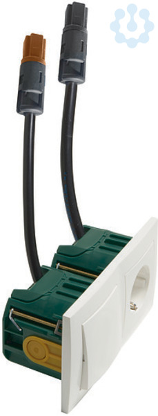 bestehend aus: (von links nach rechts) Serienschalter, 10 A 250 V ,SCHUKO Steckdose mit Schraubklemmen, 2-polig, 10/16 A 250 V ,im 2 -fach Rahmen, mit Anschlusskabel und WAGO WINSTA RD (rund) Steckverbinder, Kabellänge 30 cm und halogenfreier Attema-Dose UHW50, Ausführung horizontal