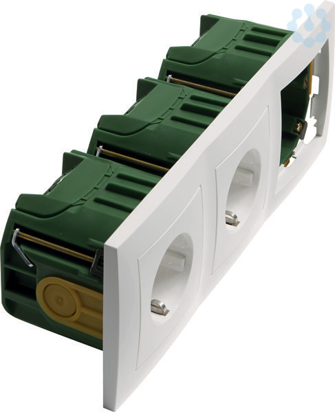 Bestehend aus: Kombi-Rahmen, 3fach, Doppel-Steckdose SCHUKO® 2-polig, 16 A 250 V, mit schwarzem Kodierstecker A sowie einem leeren Steckplatz zur individuellen Nutzung, intern verdrahtet, für die Montage in Hohlwänden, inkl. Hohlwanddose