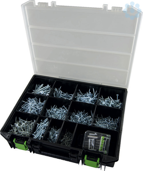 Schrauben-Sortimentskasten ?Senkkopf?Inhalt: 1.800 Schrauben im Kunststoffkasten 415 x 335 x 90 mmMenge ? Bezeichnung ? Größe ? Antr. ? Art. Nr. ? 200 ? Universal Senkkopfschrauben ? 3,5 x 20 ? PZ2 ? 790015 ? 200 ? Universal Senkkopfschrauben ? 3,5 x 30 ? PZ2 ? 790017 ? 200 ? Universal Senkkopfschrauben ? 3,5 x 40 ? PZ2 ? 790079 ? 200 ? Universal Senkkopfschrauben ? 4,0 x 30 ? PZ2 ? 790027 ? 200 ? Universal Senkkopfschrauben ? 4,0 x 40 ? PZ2 ? 790029 ? 200 ? Universal Senkkopfschrauben ? 4,0 x 50 ? PZ2 ? 790031 ? 200 ? Universal Senkkopfschrauben ? 4,5 x 40 ? PZ2 ? 790041 ? 100 ? Universal Senkkopfschrauben ? 5,0 x 40 ? PZ2 ? 790053 ? 100 ? Universal Senkkopfschrauben ? 5,0 x 50 ? PZ2 ? 790054 ? 100 ? Universal Senkkopfschrauben ? 5,0 x 60 ? PZ2 ? 790055 ? 50 ? Universal Senkkopfschrauben ? 6,0 x 60 ? PZ3 ? 790064 ? 50 ? Universal Senkkopfschrauben ? 6,0 x 80 ? PZ3 ? 790065 ? 1 ? Bit-Box 17-teilig, inkl. Halter ? ? ? 102210