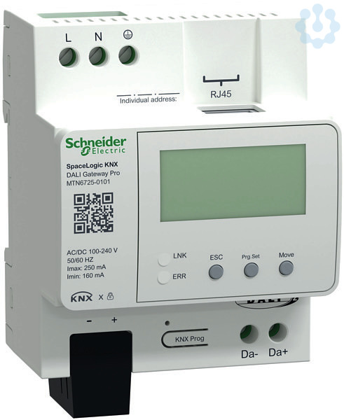 DALI Gateway Pro, REG,. SpaceLogic KNX DALI Gateway Pro 2.0. Das SpaceLogic KNX DALI Gateway Pro steuert elektronische Vorschaltgeräte mit DALI-Schnittstelle über den KNX Installationsbus. Das Gateway ist DALI 2.0 Multi-Master-zertifiziert. Das Gateway unterstützt KNX Longframe-Kommunikation und ist kompatibel mit KNX Sicherheitstelegrammen/-geräten und kann in der ETS 5 Software aktiviert werden. Darüber hinaus ist der Zugriff auf das Gerät selbst (z.B. für einen Download) durch KNX Secure geschützt. Es unterstützt Vorschaltgeräte nach EN 62386-102 ed1 (DALI1), Geräte nach EN 62386-102 ed2 (DALI2), sowie DALI2-Bewegungsmelder und Lichtsensoren nach EN 62386-303 und EN 62386-304. Das Gateway verfügt über einen DALI-Ausgang, der bis zu 64 EVGs steuern kann. Zusätzlich können bis zu 8 DALI2-Bewegungsmelder oder Lichtsensoren angeschlossen werden. Ein Multi-Master-Betrieb nach EN 62386-103 ed2 ist zulässig. Die erforderliche Stromversorgung für die angeschlossenen EVGs und Bewegungsmelder wird direkt vom Gerät b