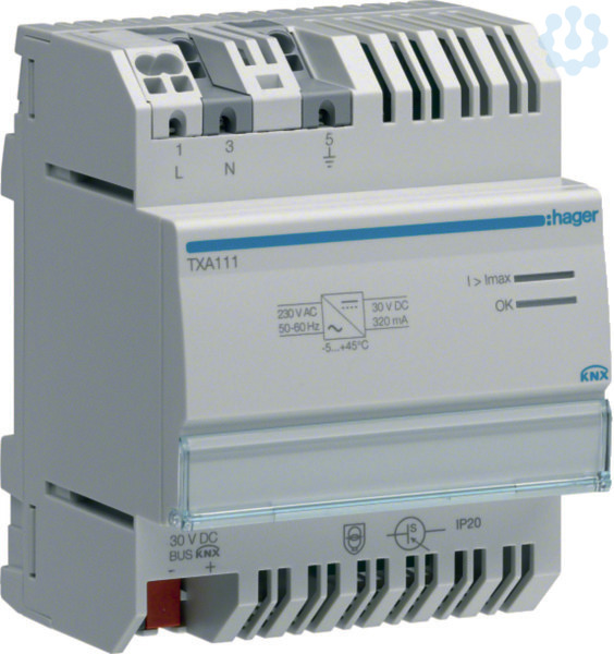 Spannungsversorgung KNX mit 1 Ausgang und 1 Drossel, 320mA. Spannungsversorgung zur Erzeugung der notwendigen Systemspannung. Ein Ausgang 30 V DC mit Drossel auf Busklemme. Bestehend aus Reiheneinbaugerät mit Steckklemmen QuickConnect 3-polig für die Spannungsversorgung, grüne LED zur Anzeige für Spannungsversorgung, rote LED zur Anzeige für Kurzschluss oder Überlastschutz, KNX Busklemme 2-polig und Beschriftungsfeld.