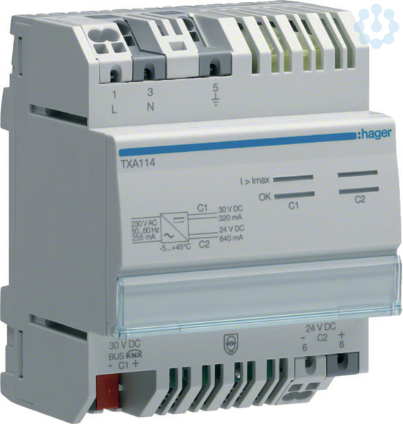 Spannungsversorgung KNX mit 1 Ausg. inkl. Drossel 320mA + 1 Ausg. 24VDC, 640mA. Spannungsversorgung zur Erzeugung der notwendigen Systemspannung. Ein Ausgang 30 V DC mit Drossel auf Busklemme und ein zusätzlichen Ausgang 24 V DC ungedrosselt auf Steckklemmen QuickConnect 2-polig. Bestehend aus Reiheneinbaugerät mit Steckklemmen QuickConnect 3-polig für die Spannungsversorgung, zwei grüne LED´s (Anzeige für Spannungsversorgung), zwei rote LED´s (Anzeige für Kurzschluss oder Überlastschutz), KNX Busklemme 2-polig und Beschriftungsfeld.