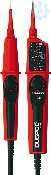DUSPOL analog. Spannungsprüfer mit Tauchspul-Pegelanzeige. Geeignet für Elektrotechnik, Industrie, Instandhaltung, Service (Fehlersuche), Photovoltaik-/ Windkraftanlagen und Hybrid-Fahrzeugtechnik. Prüfart 2-polig. Spannungsanzeige LED. Spannungsmessbereich 12 V - 1000 V AC/DC. Anzeigestufen: 12, 24, 50, 120, 230, 400, 690, 1000 V AC/DC. Drehfeldrichtungsanzeige ja, LCD. Polaritätsanzeige ja, LED. Einpolige Phasenanzeige ja, rote LED. Direktanzeige ohne Drucktasterbetätigung, hochohmige Prüfung. Lastzuschaltung über Drucktaster, niederohmige Prüfung. Bewusste Auslösung des RCD/FI-Schutzschalters. Vibrationsalarm im Prüfgriff. Interne Grundlast ja. Last zuschaltbar ja. Verwendbar bei Niederschlägen ja, Schutzart IP 65 staubdicht, strahlwassergeschützt. Robuste Gehäuseausführung mit gummierter Grifffläche. Geprüft und zugelassen nach DIN EN 61243-3, VDE 0682-401:2015. Messkreiskategorie Cat IV. Max. Spannung Messkreiskategorie 600 V. Messkreiskategorie Cat III. Max. Spannung Messkreiskategorie 1000 V. Länge 260