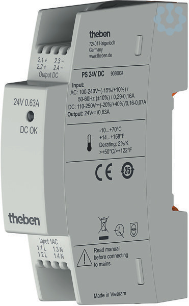 Primär getaktete Spannungsversorgung 24 V DC, 0,63 A, Zur Spannungsversorgung von 24V-Geräten, beispielweise der 24V-Versionen der Meteodata 140 S KNX, Baubreite 1 TE, Weitbereichseingangsspannung (100-240 V AC / 110-250 V DC), Push-In Steckklemmen (doppelte Anschlüsse, 45° Winkel), Höchste Energieeffizienz in Leerlauf- und Teillastbetrieb (Efficiency Level VI)