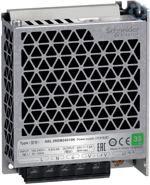 Die getakteten Spannungsversorgungen der Baureihe Modicon ABL2 eignen sich ideal für einfache Anwendungen in der Industrie sowie in Gewerbe- und Wohngebäuden. Die Produktfamilie Easy Modicon ABL2 besticht durch seine kompakte Bauweise und umfasst dabei Netzteile mit Ausgangsspannungen von 24V DC. Diese 1-phasige Spannungsversorgung mit einer Nennleistung von 35W verfügt über eine Eingangsspannung von 100-240V AC und eine Ausgangsspannung von 24V DC/1,5A. Die Montage des Netzteils erfolgt wahlweise durch Aufschraubung auf einer Montageplatte, per Aufrastung auf einer Hutschiene (mit Zubehör) oder per Montage auf einem L-Winkel. Dabei entspricht das Produkt internationalen Standards und Zertifizierungen wie CE, EAC, KC, RCM, EN62368-1, EN 61000-6-2, EN 61000-4-2/3/4/5/6/8/11, 55032 class B, RoHS.