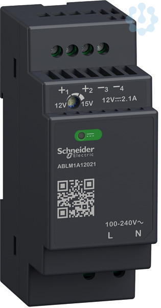 Spannungsversorgung Modicon der Baureihe MODULAR für Anwendungen in der Industrie sowie Gewerbe- und Wohngebäude. Ausgang mit 12V/2,1A. Nennleistung 25W. Kunststoffgehäuse zur Aufrastung auf einer Hutschiene oder aufschraubbar auf Montageplatte. Arbeitsprinzip elektronische Taktung. Mögliche Betriebstemperatur bis +70°C. Gehäusefarbe ist dunkelgrau. Eingang unten, Ausgänge oben am Gerät. Eingangsspannung 100-240 VAC (50/60 Hz). Zugang zu Dokumentation per QR-Code auf dem Gerät. IEC/EN 62368-1 konform, CE, CB-Scheme,cULus,cURus,RCM,EAC. Die Baureihe Modicon ABLM Modular umfasst Spannungsversorgungen mit Ausgangsspannungen von 5VDC, 12VDC oder 24VDC.