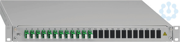 Spleissbox, ausziehbar, 19'/1HE, 12xLC-D OS2 APC grün, - pulverbeschichtetes Stahlblechgehäuse, - werkseitige Portkennzeichnung, - mit Gleitauszug, Auszugtiefe ca. 20 cm, - im geöffneten Zustand nach unten neigbar, - mit Rändelschrauben verschließbar, - 40 mm rückversetzbare Box, - Spleisskassette zur Aufnahme von 12 oder 24 Pigtails, - mit max. 4 Spleisskassetten bestückbar (fixiert), - eingelegter Crimpspleisshalter, - spleissfertig vorbereitet mit abgesetzten und eingelegten Pigtails inkl. 12 x LC-D - Keramik-Kupplungen, - LC-Faserpigtails E9/125 Ám, 2 m, SM APC, Grade B, - mit Messprotokoll für alle Fasern inkl. Seriennummer, - 12 montierte Blindstopfen, - 4 x rückseitige PG16-Verschraubungen (je 2 x rechts/links), - 1 x PG16-Verschraubung im Lieferumfang, - lichtgrau (ähnlich RAL 7035)