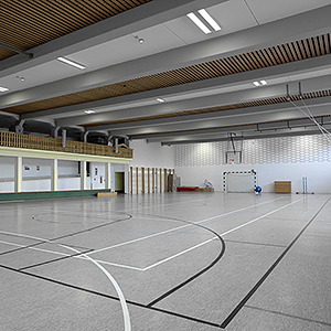 Stahlblechgehäuse Lichtverteilung direkt breitstrahlend mittels Metallraster, Stahlblech, mit stabilen, glatten Querlamellen, weiß lackiert ähnlich RAL 9016, mit V-Reflektor, einseitig abklappbar, ballwurfsicher. Rasterbefestigung über federnde, ballwurfsichere Verschlüsse, die nur mit Werkzeug zu öffnen sind, Bestückung 1x Regiolux LED-Einheit Lichtfarbe neutralweiß (840) mit sehr guter Farbkonsistenz und hoher Farbwiedergabe Ra>80, Elektrischer Anschluss über 5-polige Anschlussklemme in Steckkontakt-Technik.