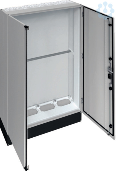Schrank, univers, IP55/II, 1700x1050x275mm + 200mm Sockel. Einzelstandverteiler für die Innenraummontage mit VDE-Gutachten (Fertigungsüberwachung) nach DIN EN 61439-1/-2/-3 und Maßnorm DIN 43 870, zur Aufputz Montage. Zum Aufbau einer Niederspannungsverteilung bis 800 A, 3AC 230/400 V 50 Hz. Schutzart IP55, Schutzklasse I oder II, Luft- und Kriechstrecken nach DIN VDE 0110-1/-2. Bestehend aus Schrank mit Tür aus pulverbeschichtetem, eingebranntem, profiliertem 1,5 mm dicken Stahlblech. Durchsteckflansche oben, unten offen (Leitungseinfügungen einbaubar). Sammelschienendurchführungen als seitliche Vorprägung. Tür aufliegend, mit innen liegenden Scharnieren, Türanschlag standardmäßig rechts, wechselbar, mit 110 Grad Öffnungswinkel. Serienmässig mit Schwenkhebelverschluss, DIN-Profil-Halbzylinder einbaubar. Waagerechte Abfangschiene zur stabilisierung im Schrank enthalten. Türdichtung umlaufend geschäumt, temperaturbeständig und ölbeständig. Sockelleiste (Höhe 200 mm) serienmäßig montiert mit abnehmbarer Frontbl